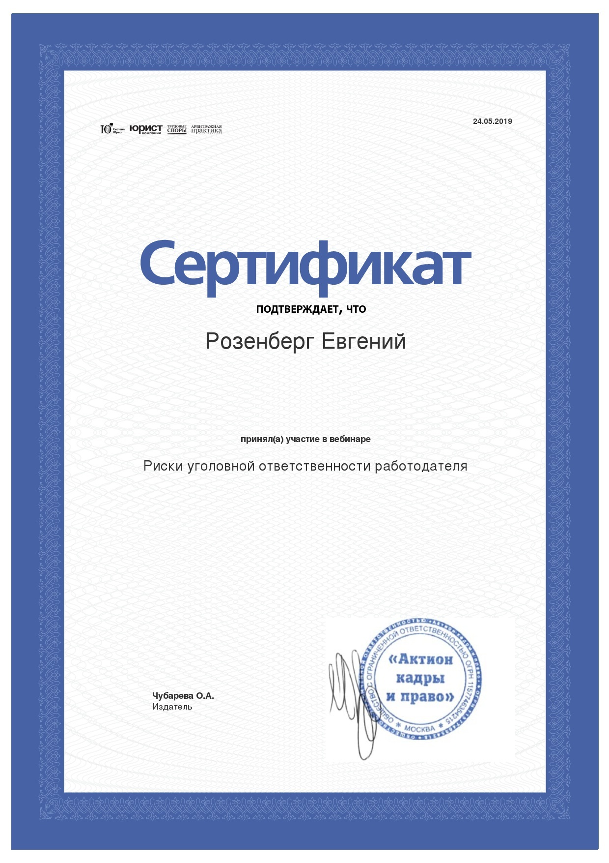 Сертификат о прохождении обучения по дисциплине "Риски уголовной ответственности работодателя"