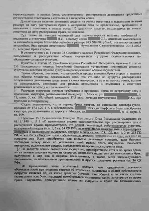 В результате нашей активной позиции суд первой инстанции удовлетворил требования истца. о разделе участка в равных долях. Требования о взыскании денежных средств в размере 120 тыс. Евро судом отклонены, так как они были израсходованы в период брака, доказательств наличия средств на счетах на дату расторжения брака не представлено. Также суд не удовлетворил требования о компенсации за проданный автомобиль, так как денежные средства были использованы в интересах семьи.