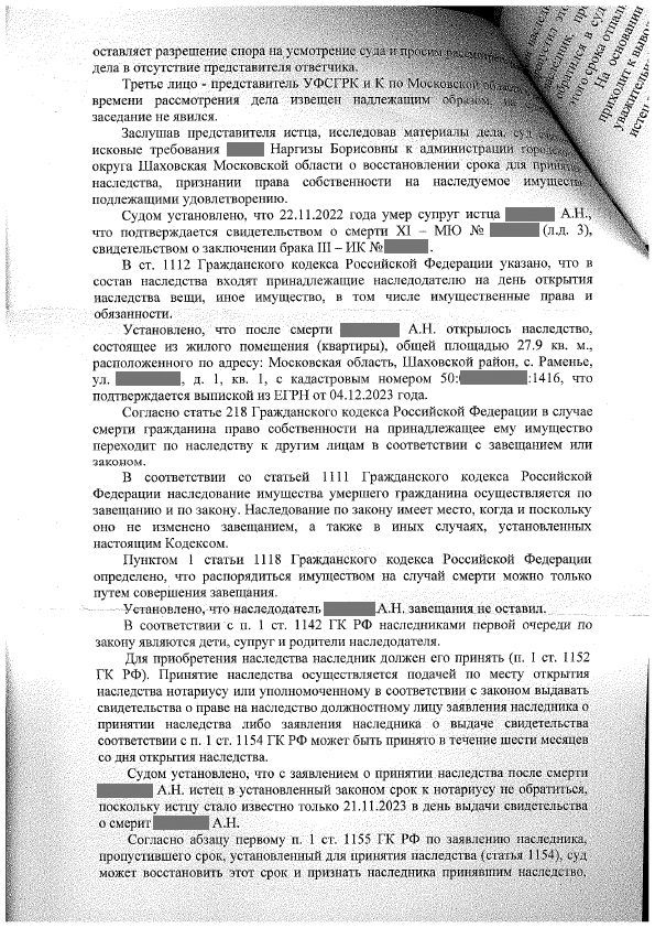 Проанализировав ситуацию и имеющиеся документы, нами было подготовлено исковое заявление к Администрации городского округа Шаховская Московской области. Нами было представлено правовое обоснование и доказательства наличия уважительной причины пропуска шестимесячного срока для принятия наследства. Мы доказали суду, что клиент не знала и не могла знать о смерти наследодателя в установленный срок.